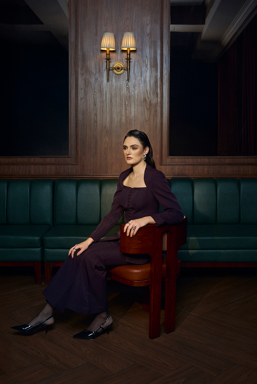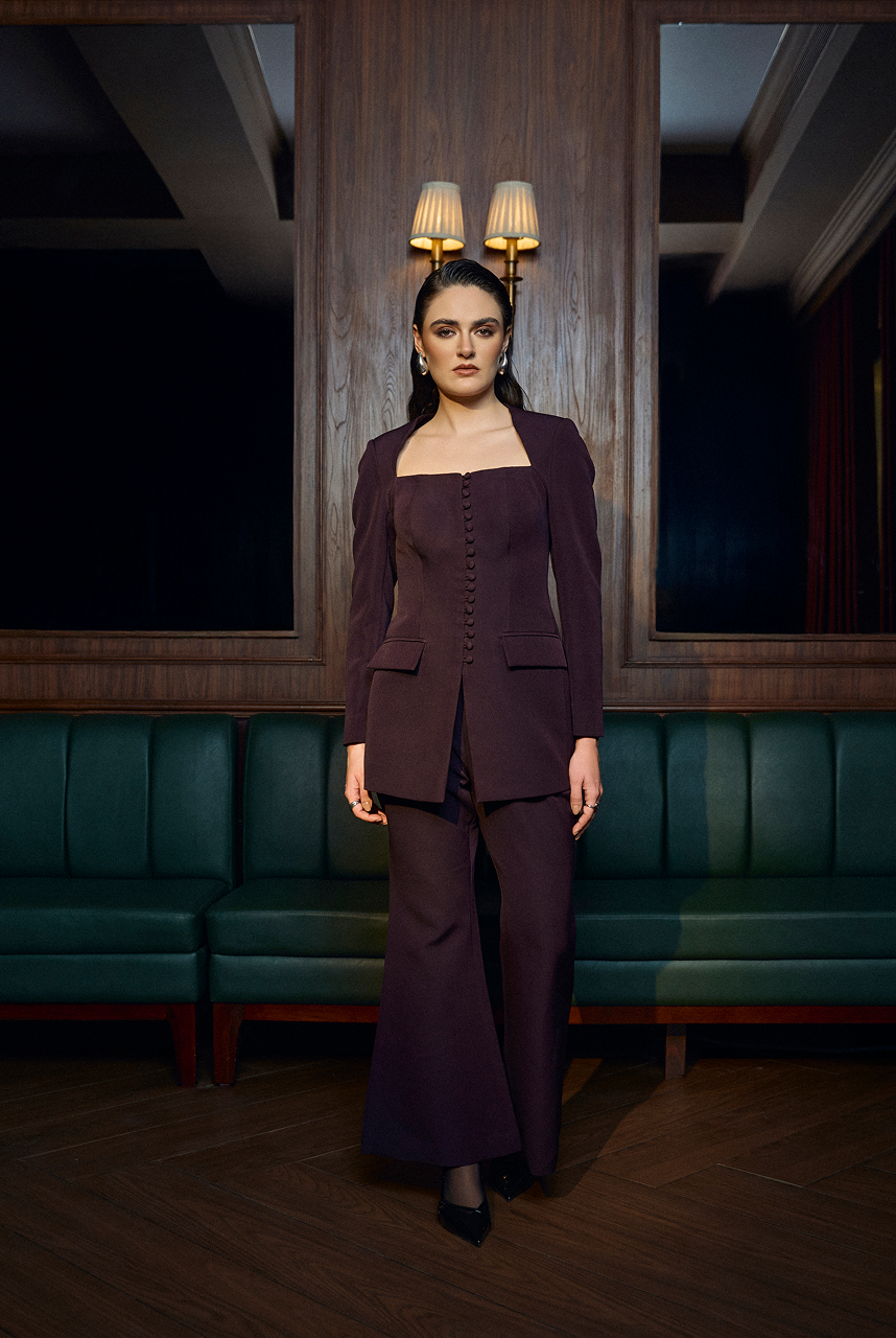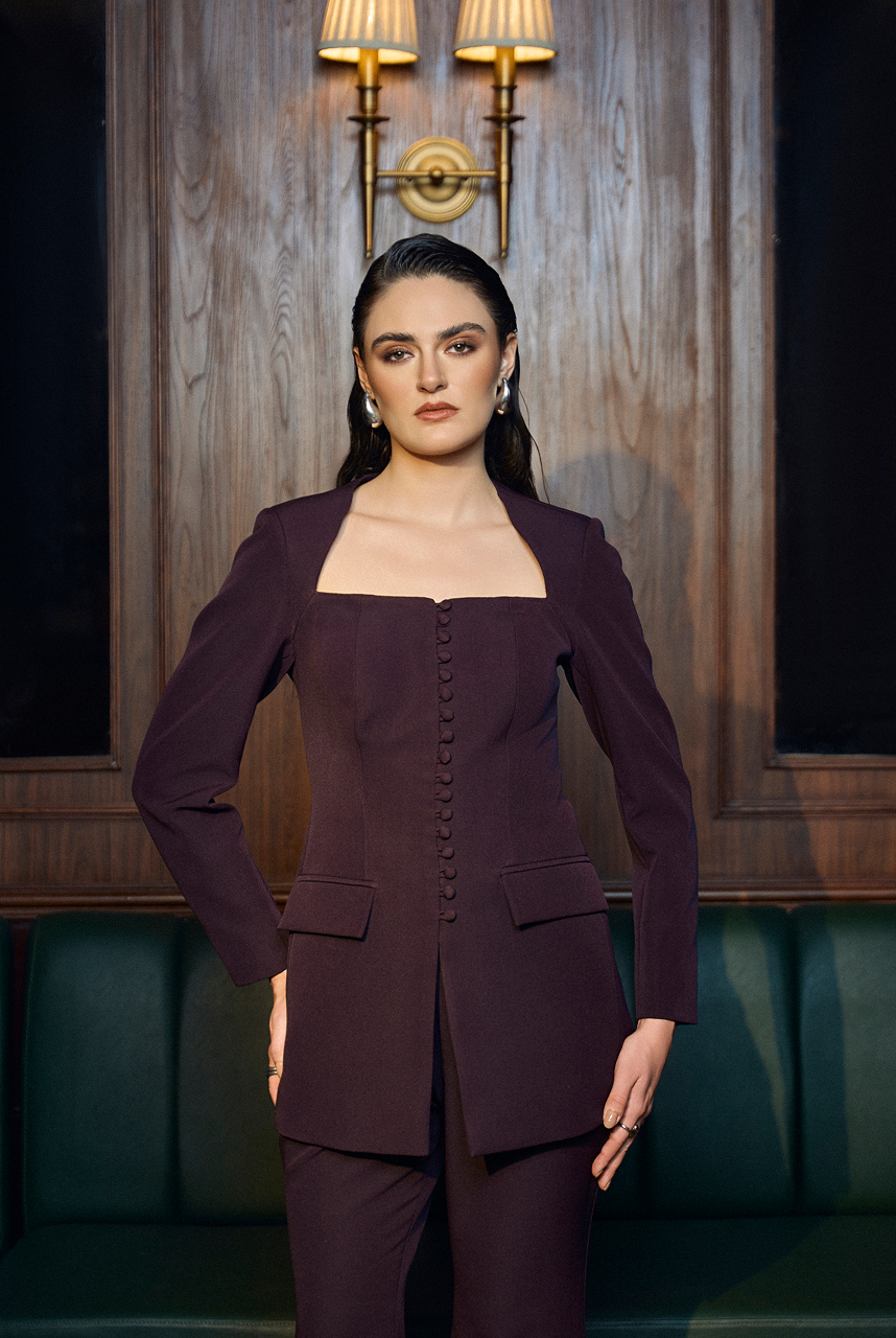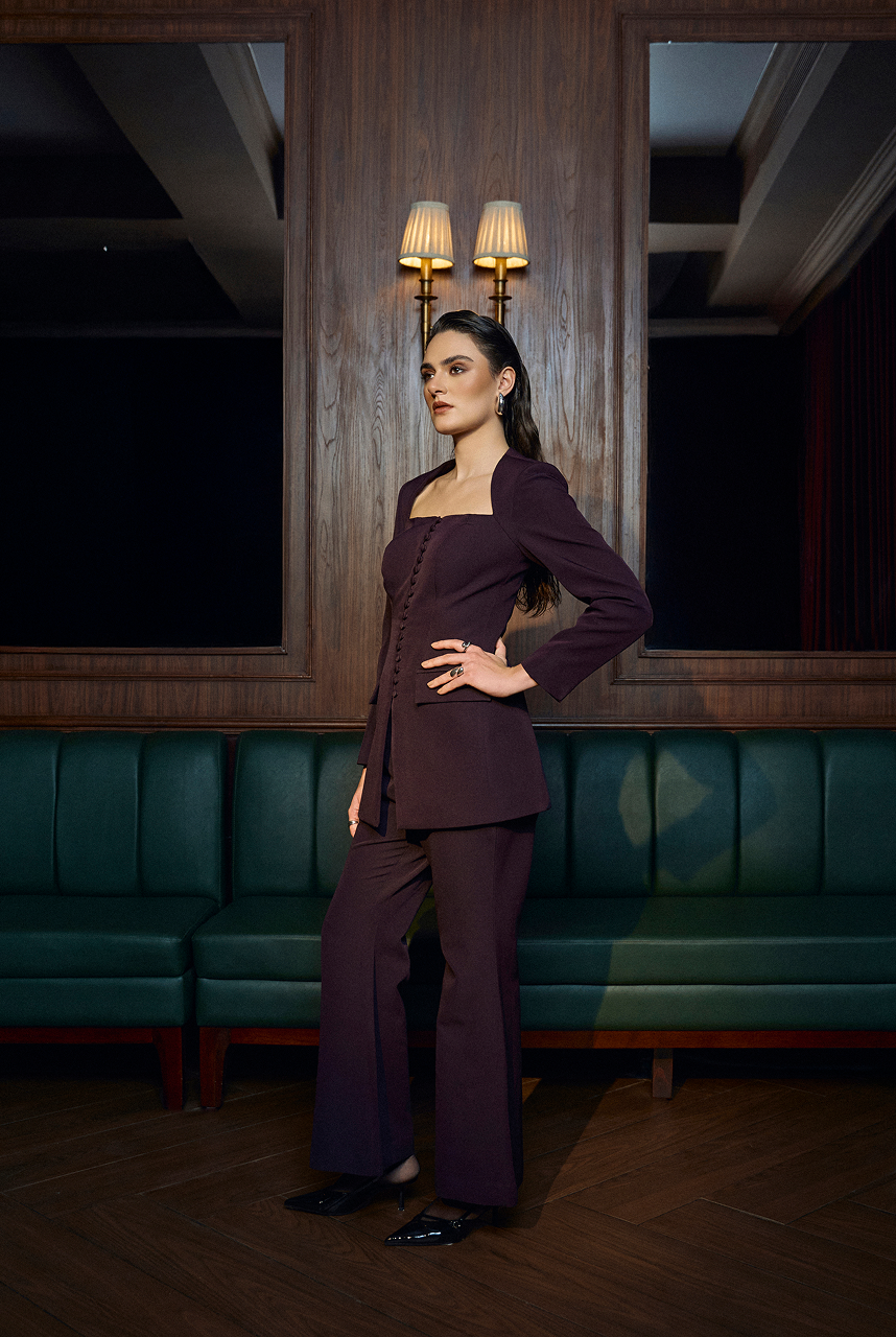Square neckline blazer with vintage style button closure paired up with bootcut pants