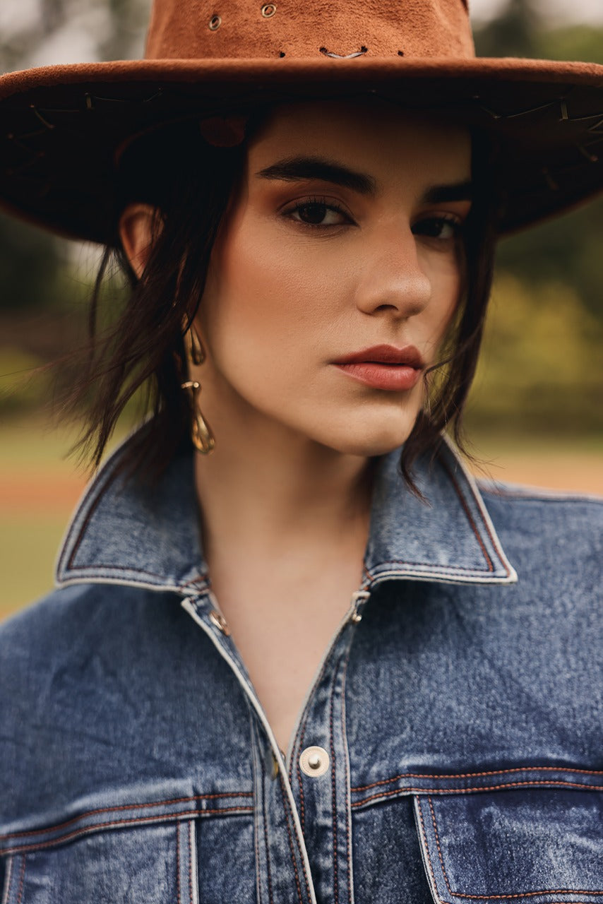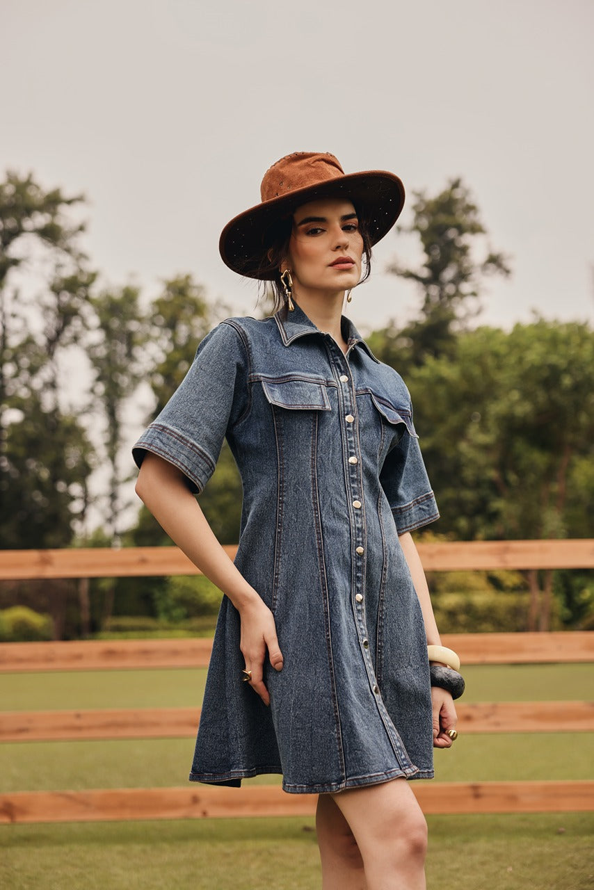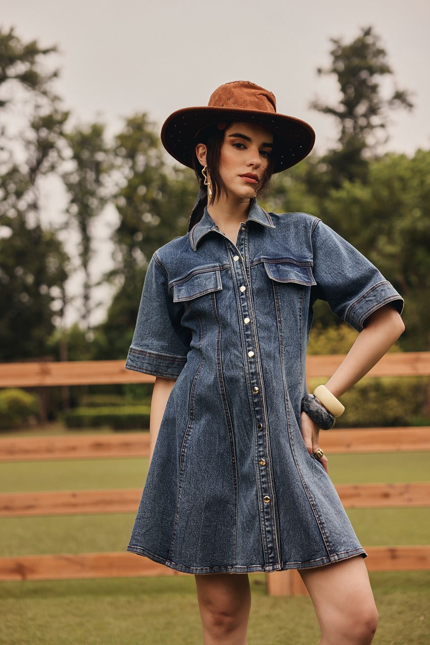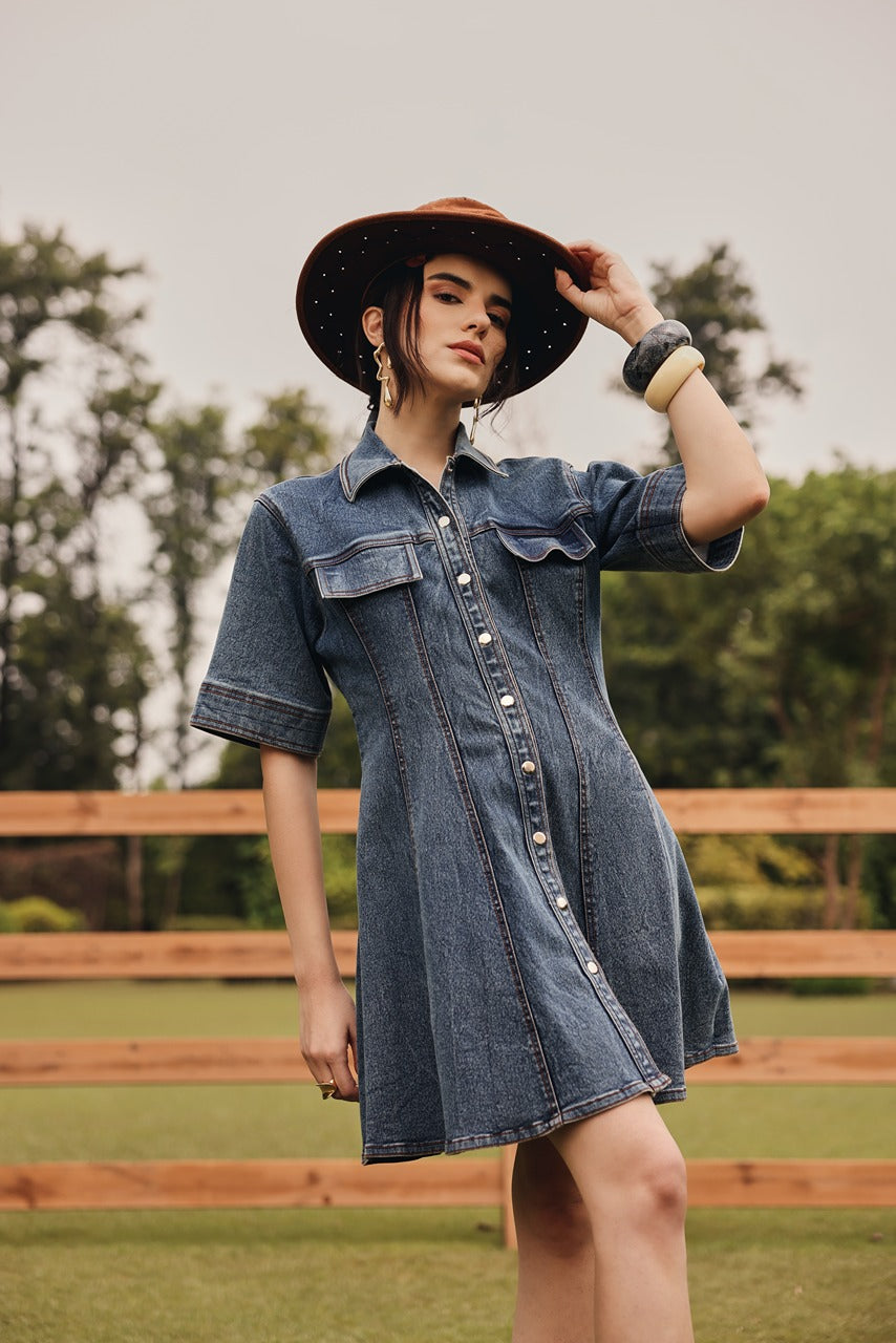 Denim panelled A line dress with pocket flaps and silver snap buttons.