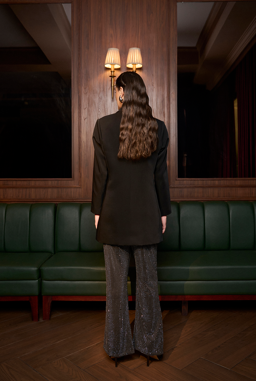 Bootcut pants with metallic Rhinestones.