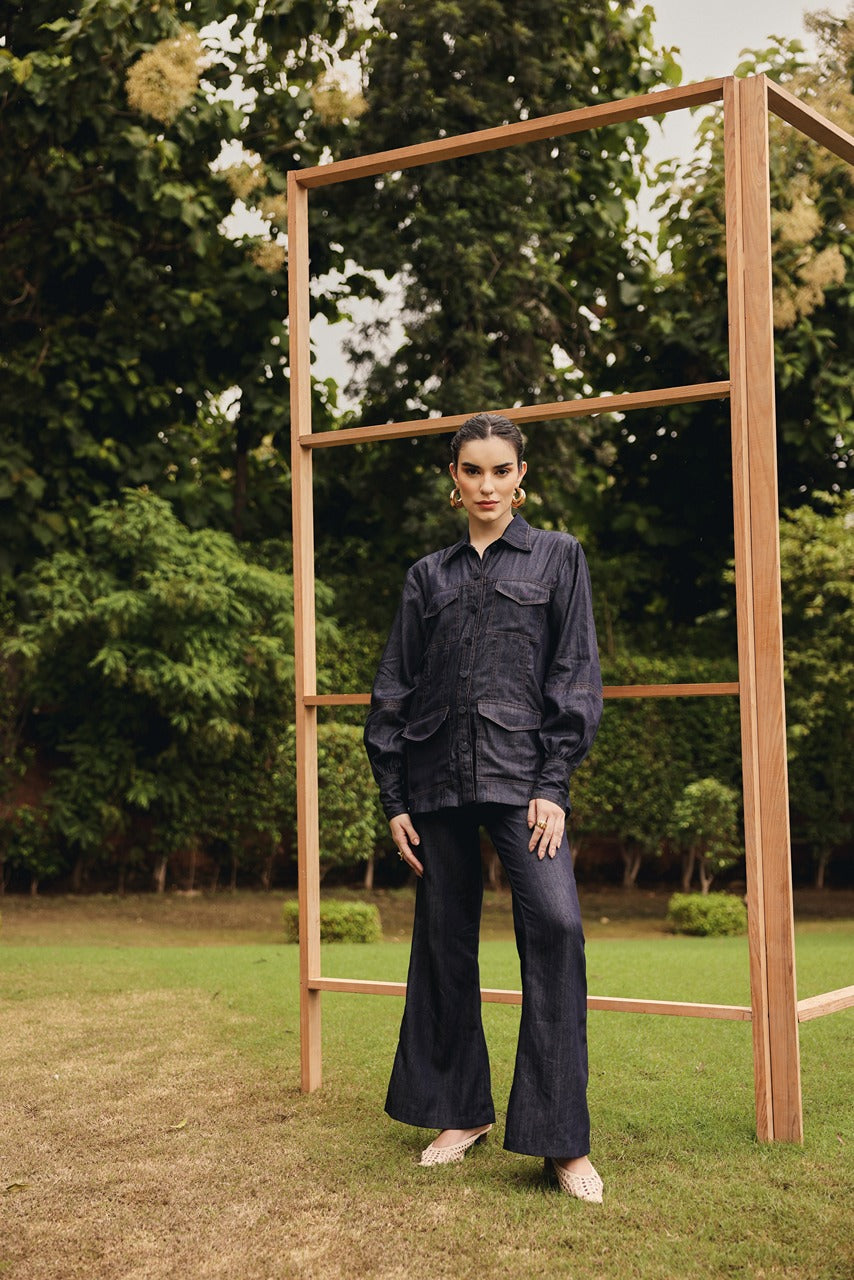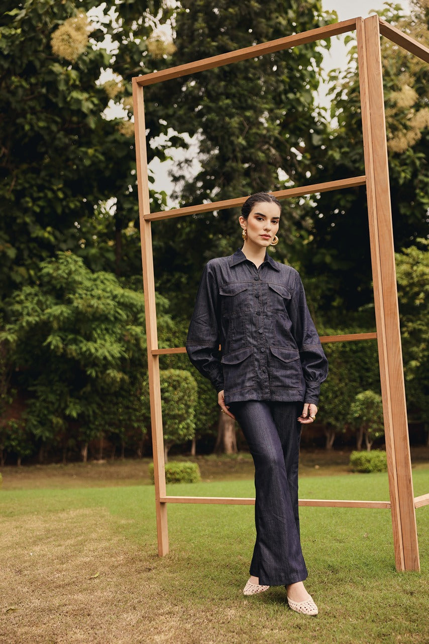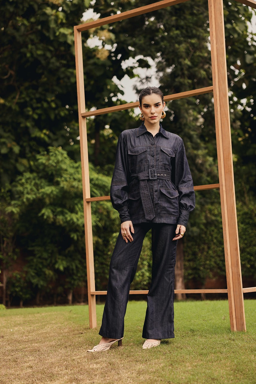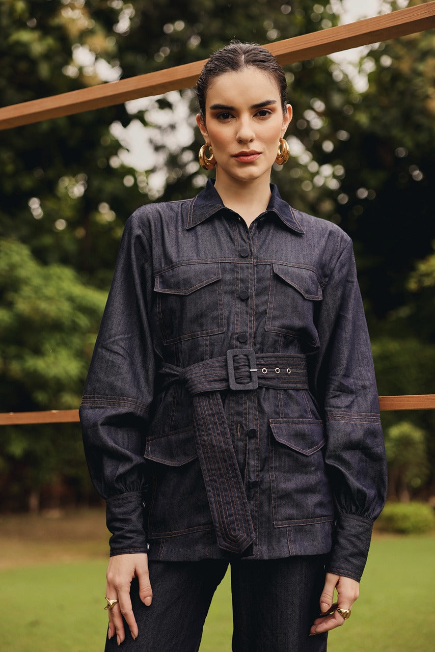 Classic denim shirt with pockets paired up with pants and a buckle belt.