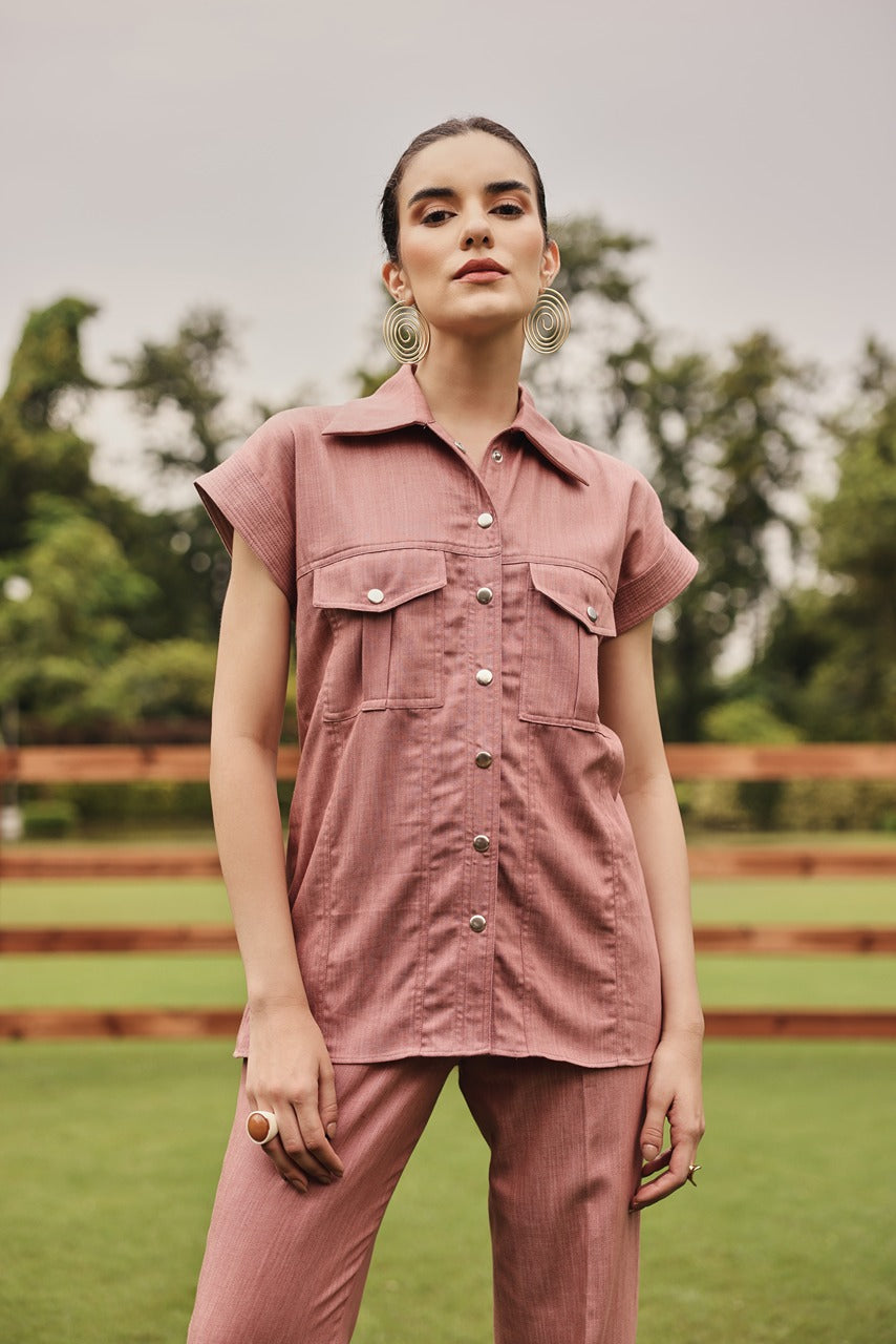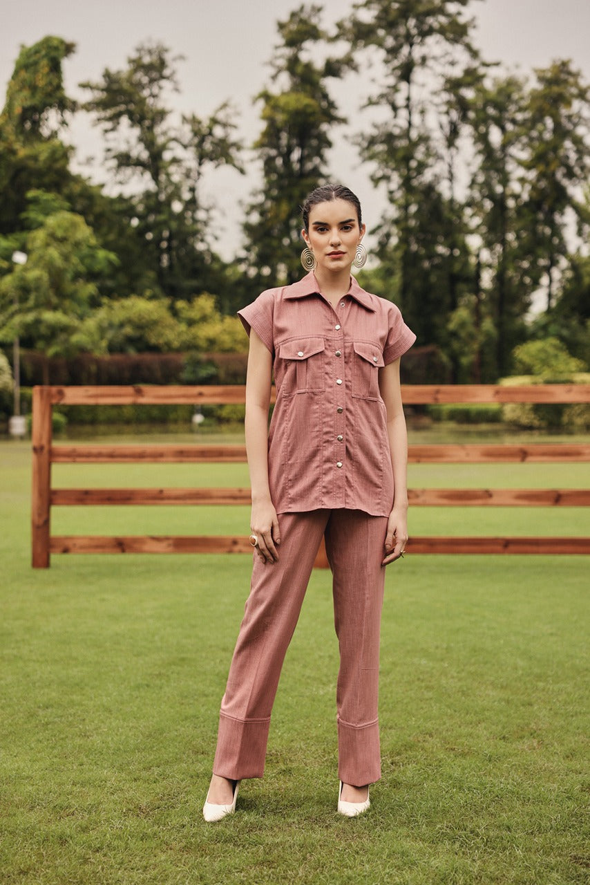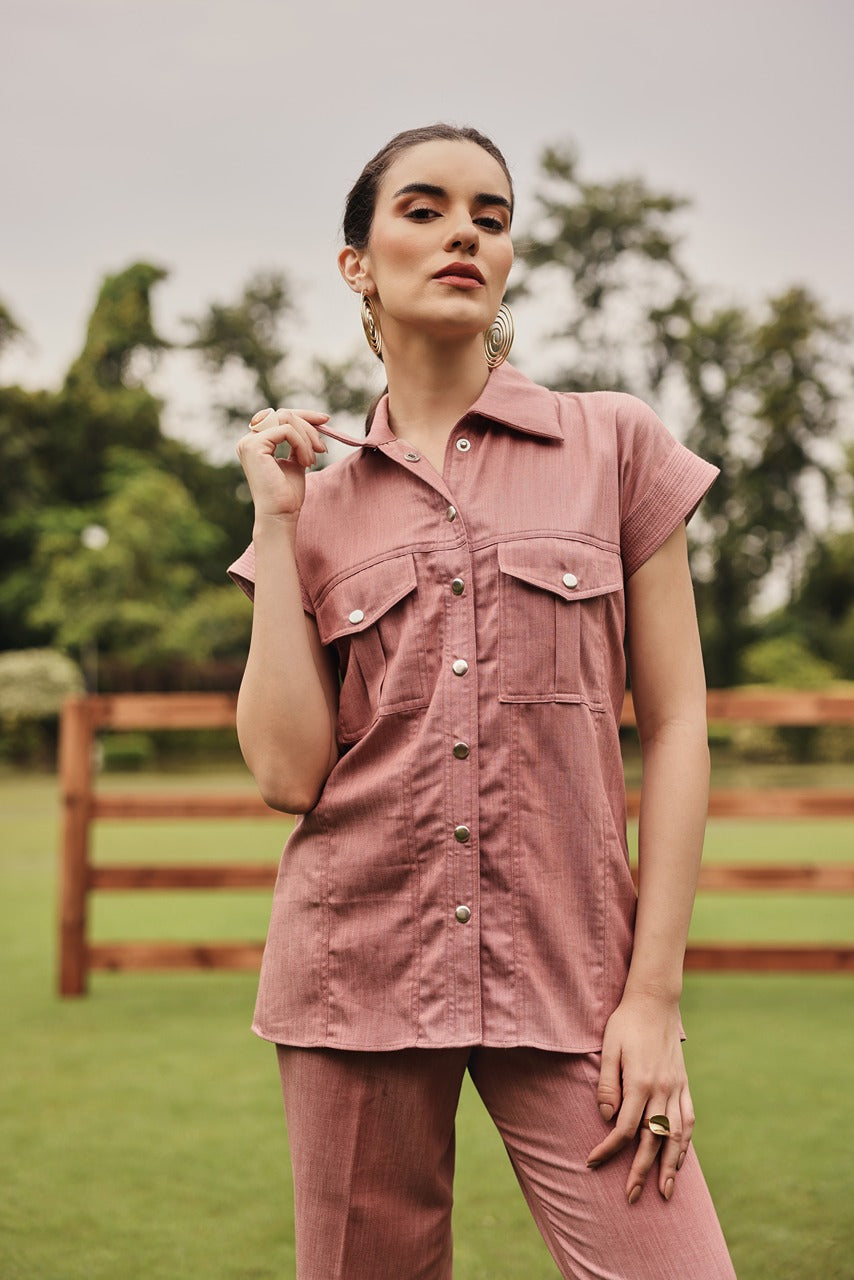 A classic button down shacket style shirt with straight pants.