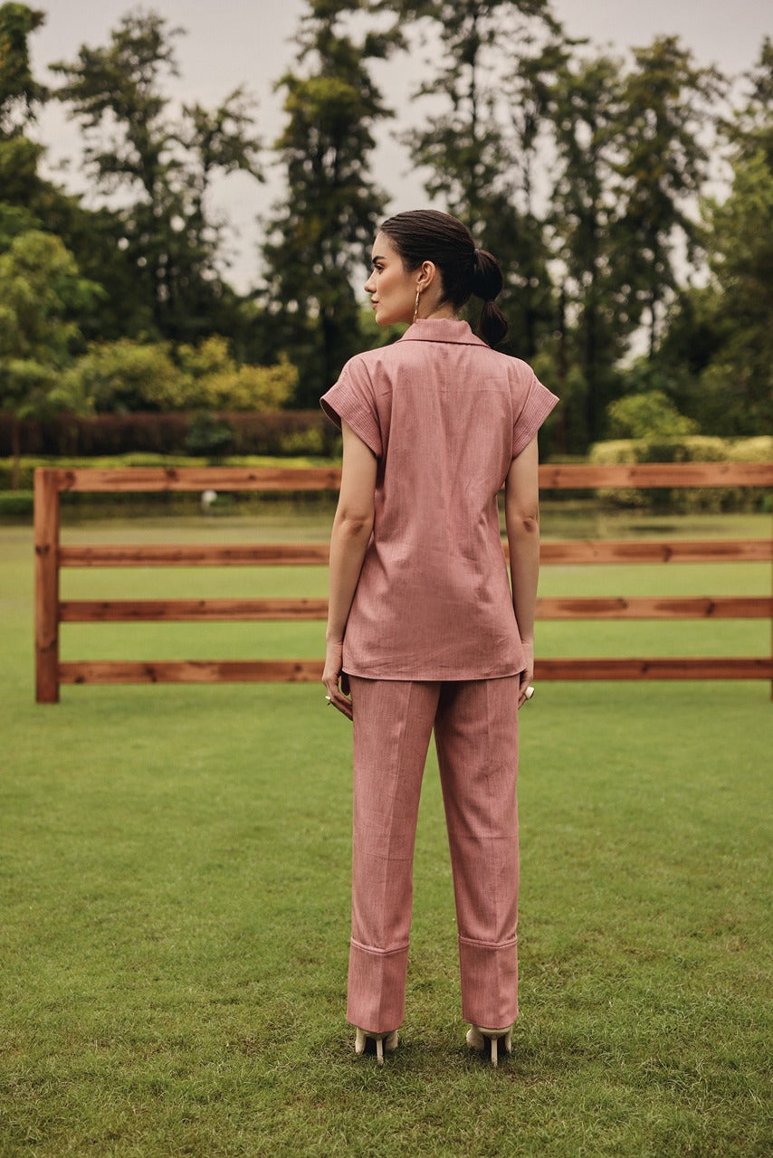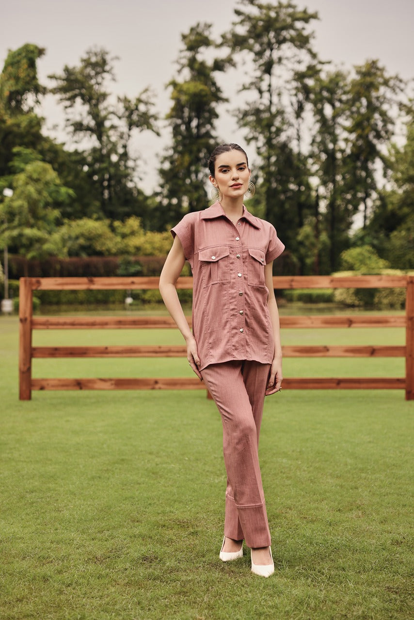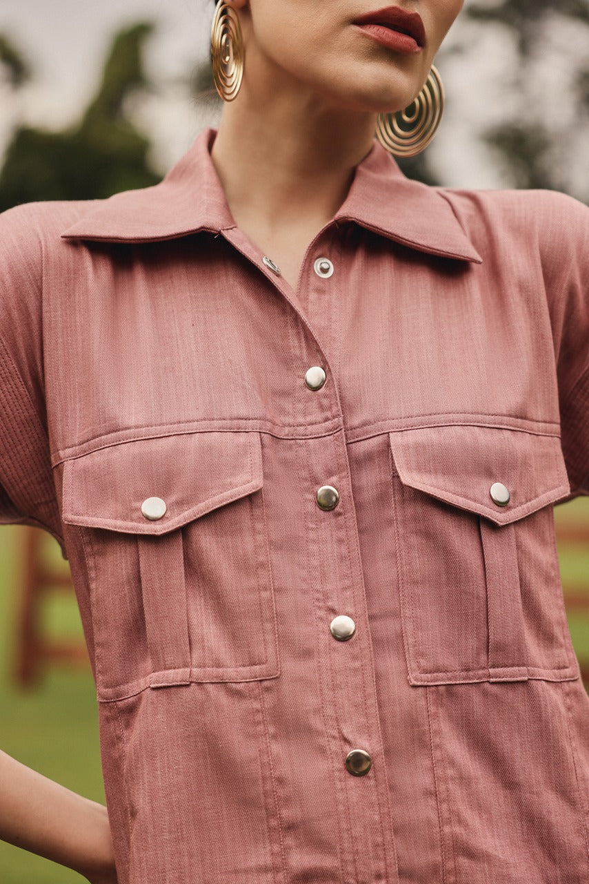 A classic button down shacket style shirt with straight pants.