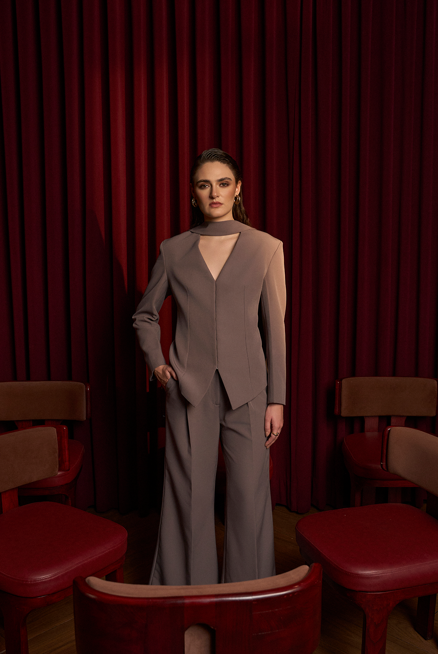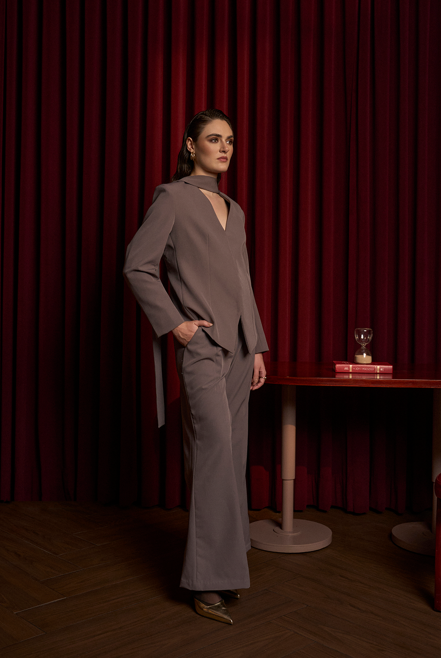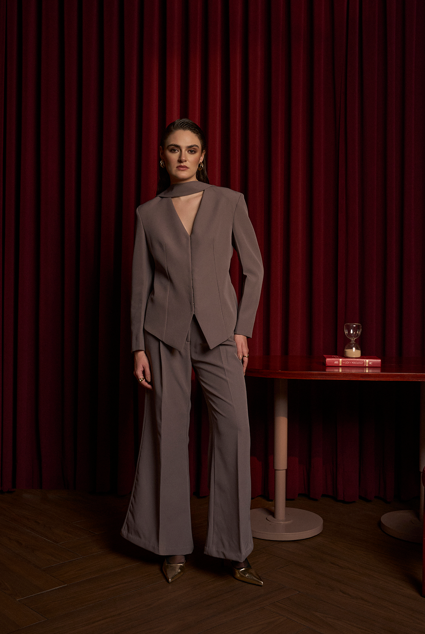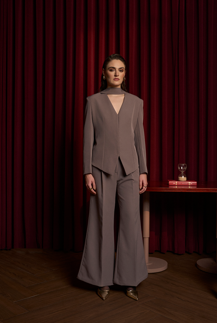 V-neck blazer with a neck tie paired up with straight flare pants.