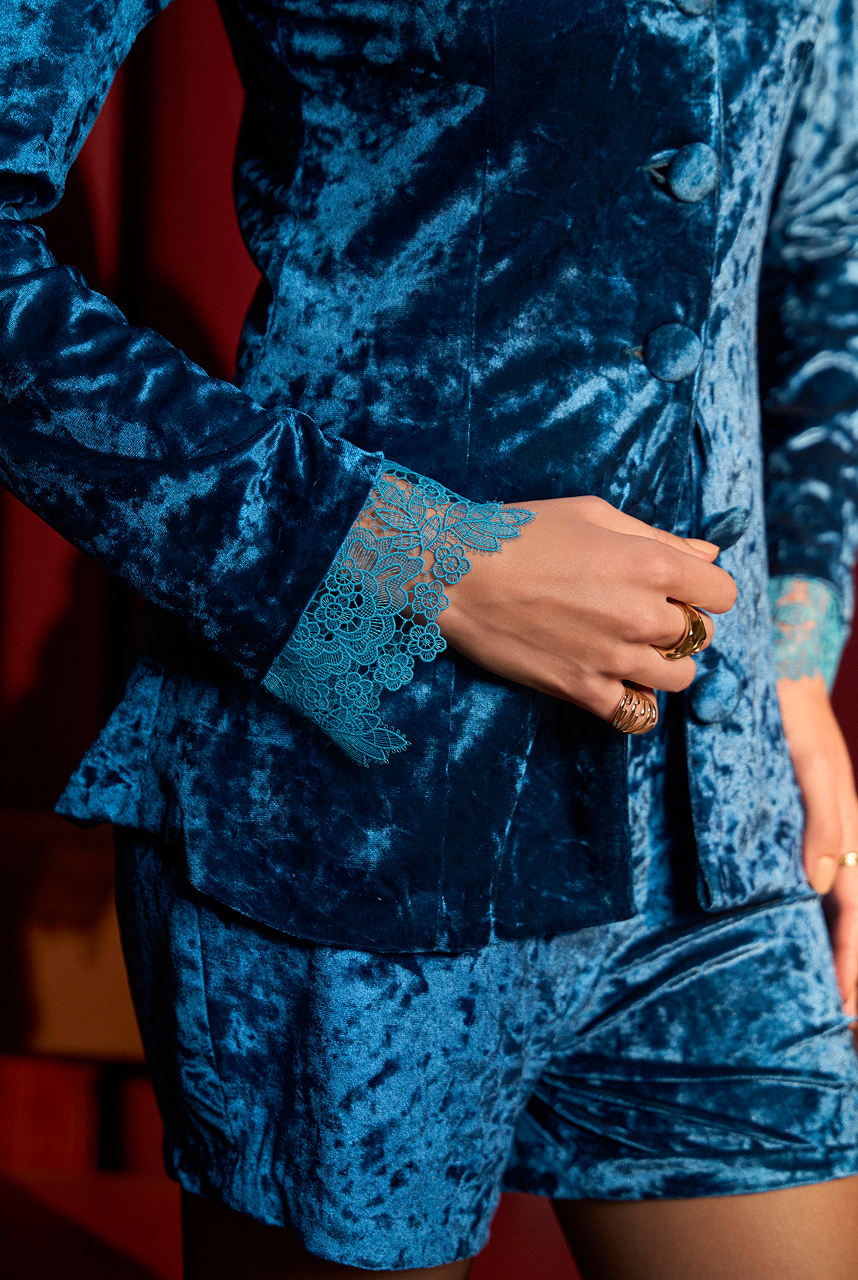 Velvet Collared shirt with lace detailing around the cuff paired up with velvet shorts